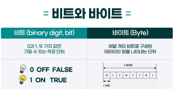 컴퓨터에서 사용하는 가장 작은 데이터 단위, 하나의 비트는 2진수 1 또는 0으로 표현되어 데이터를 처리, 저장, 전송할 때 사용