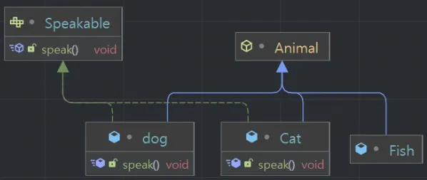 # Fish 클래스는 Animal을 상속받지만 Speakable을 구현하지 않음