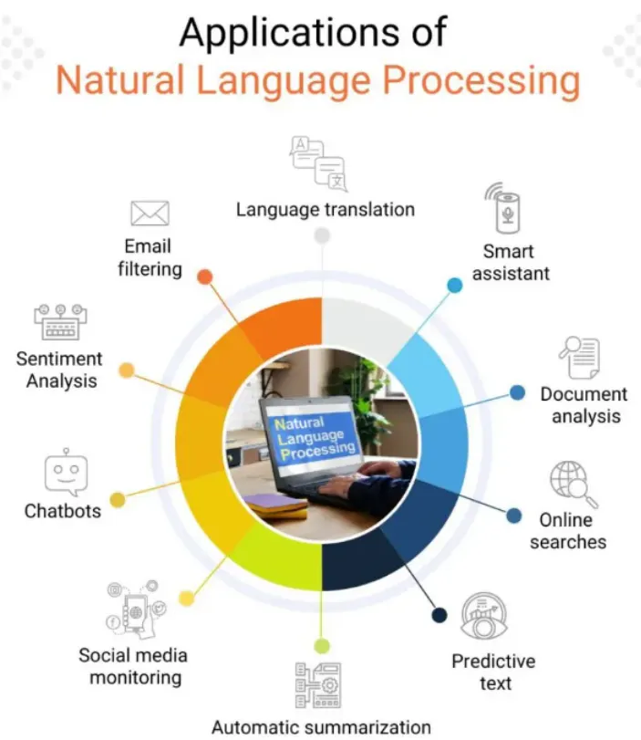 이메일 필터링(Email filtering), 언어 번역(Language translation), 스마트 비서(Smart assistants), 문서 분석(Document analysis), 온라인 검색(Online searches), 예측 텍스트(Predictive text), 자동 요약(Automatic summarization), 감정 분석(Sentiment analysis), 챗봇(Chatbots), 소셜 미디어 모니터링(Social media monitoring)