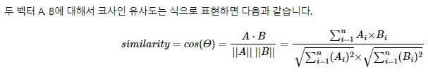 즉, 결국 코사인 유사도는 -1 이상 1 이하의 값을 가지며 값이 1에 가까울수록 유사도가 높다고 판단할 수 있다.
