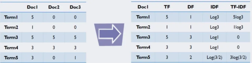 단어를 갯수 그대로 카운트하지 않고 모든 문서에 공통적으로 들어있는 단어의 경우 문서 구별 능력이 떨어진다고 보아 가중치를 축소하는 방법