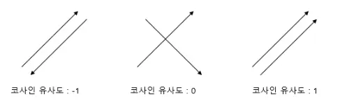 두 벡터의 방향이 완전히 동일한 경우에는 1의 값을 가지며, 90°의 각을 이루면 0, 180°로 반대의 방향을 가지면 -1의 값을 갖게 된다.