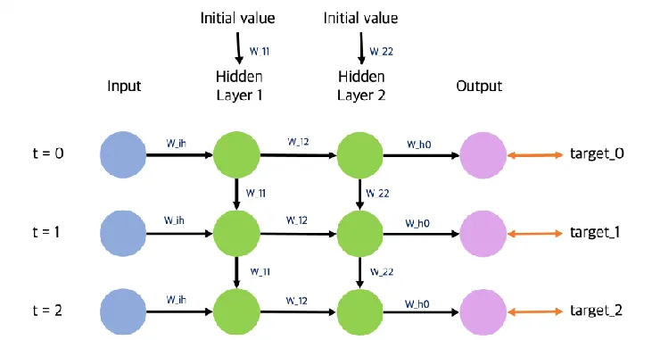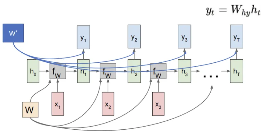 모든 시간 단계에서 가중치 는 공유되므로, 이 가중치를 업데이트하기 위해 각 시간 단계에서 역전파를 통해 그래디언트가 전파된다.