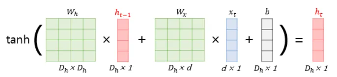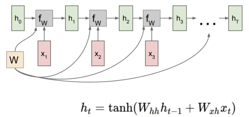은닉 상태 (h1,h2,…,hth_1, h_2, \ldots, h_th1,h2,…,ht): 이전 은닉 상태와 현재 입력을 결합하여 새로운 은닉 상태를 생성한다.