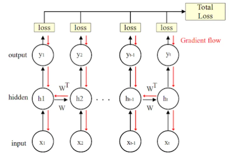 예를 들어, 에서의 손실은 의 영향을 받고, 이 과정이 반복적으로 이전 시간 단계로 거슬러 올라가면서 각 시간 단계에서의 손실 기여도를 반영하여 가중치를 업데이트한다.