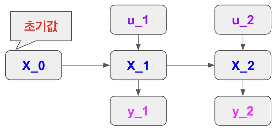 , : 시스템의 상태(state), 예를 들어, X1은 첫 번째 시간 단계에서의 상태이며, 이는 이전 상태인 과 현재 입력인 에 의해 결정, 마찬가지로, 는 과 에 의해 결정