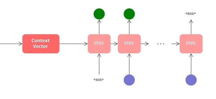 첫 RNN 은닉층 벡터로 Context Vector를 사용한다. 그리고 첫 RNN은 <sos>를 입력으로 받는다. 마지막 RNN은 <eos>를 출력한다. <sos>와 <eos>는 시작과 끝을 알리기 위해 약속된 벡터다.