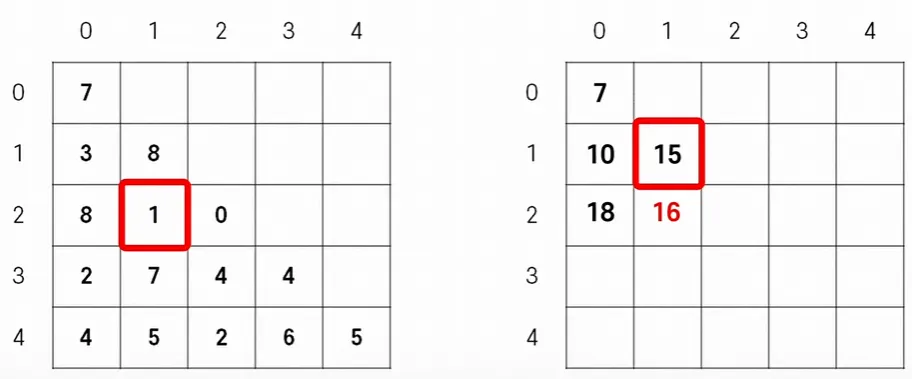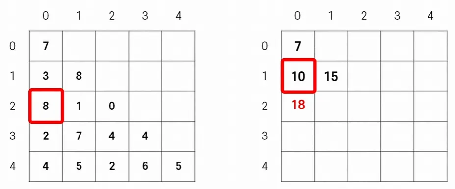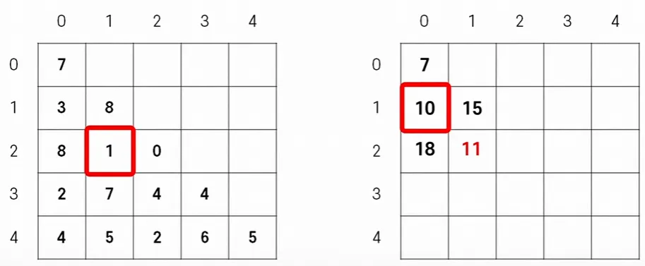 (1, 0)의 값인 10에 (2, 0)의 값인 8을 더하면 18이라는 값이 (2,0)에 담기게 된다.