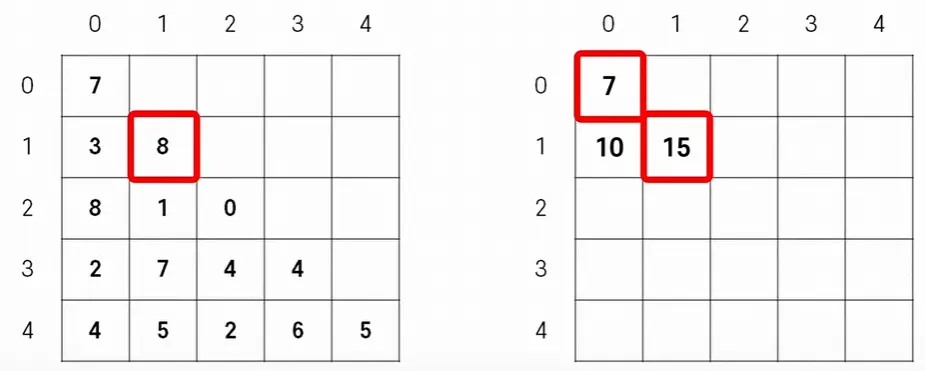 (1, 1)까지 올 수 있는 최댓값은 현재 최댓값 (0, 0)인 7에 (1, 1)의 8을 더한 15이다.