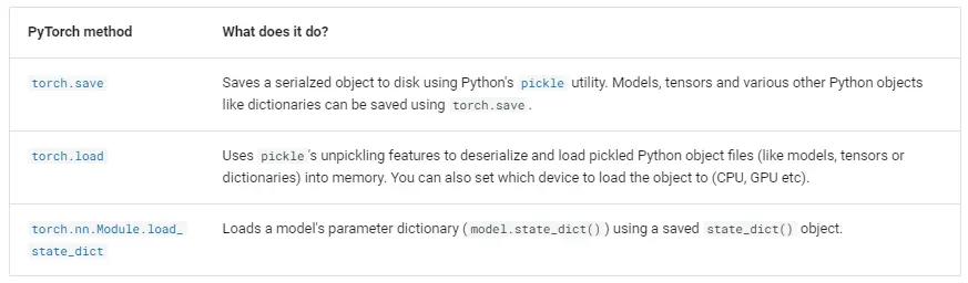 역할: 모델, 텐서, 또는 기타 파이썬 객체(예: 딕셔너리 등)를 디스크에 저장한다. 이 메서드는 파이썬의 pickle 유틸리티를 사용해 객체를 직렬화하여 저장한다.