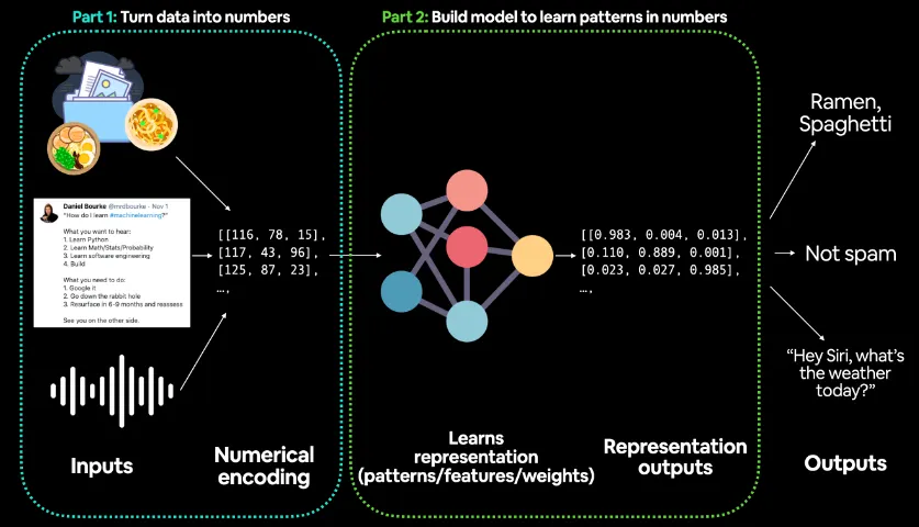 표현 학습(representation learning): 입력된 숫자 데이터를 바탕으로 패턴을 찾고, 중요한 특징(feature)을 추출한다. 이는 가중치(weights) 및 매개변수(parameters)를 학습하는 과정을 포함한다.