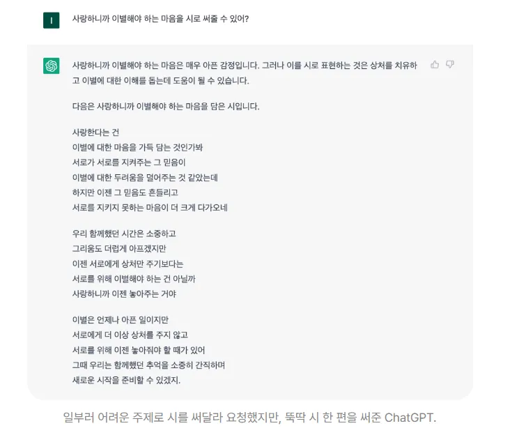 단순 정보 짜깁기를 넘어 에세이・소설・시 등 다양한 창작물을 만들고, 철학적인 대화도 가능하며 심지어 프로그래밍 코드까지 생성해 더욱 주목받음.