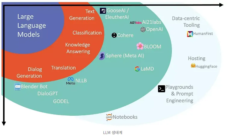 LLM은 NLP의 한 부분으로, 대량의 언어 데이터를 바탕으로 학습된 언어 모델을 사용하여 특정 NLP 작업을 수행하는데 초점