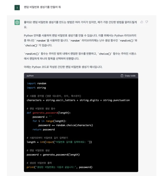 “파이썬으로 간단한 계산기를 만들어 달라”고 질문을 던지면, ChatGPT는 파이썬으로 계산기를 만드는 방법을 친절하게 알려준다.