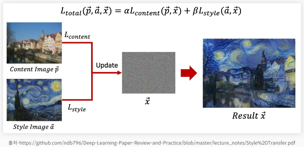 랜덤 노이즈 이미지(x)는 콘텐츠 이미지(p)와 스타일 이미지(a)를 결합해 새로운 이미지(result x)를 생성