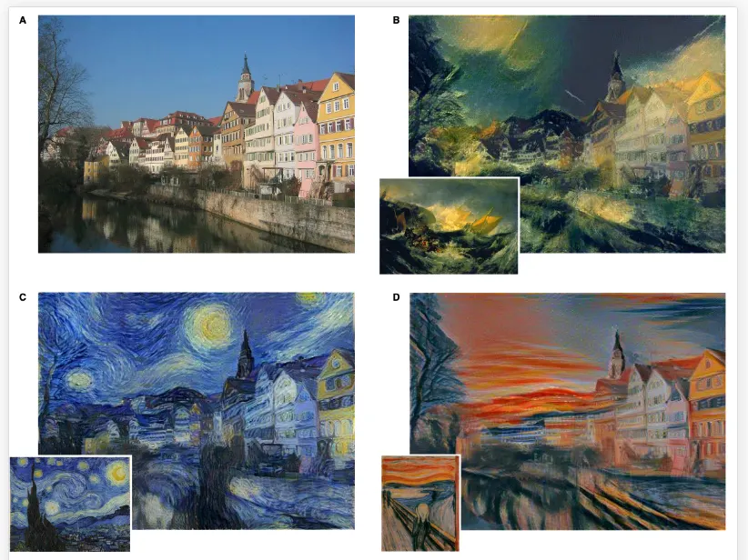 아래 예시는 원본 이미지인 A(이를 콘텐츠 이미지라고 부름)를 기준으로 각 화풍(이를 스타일 이미지라고 부름)에 맞게 스타일을 적용해 새로운 이미지를 만든 예시들이다.