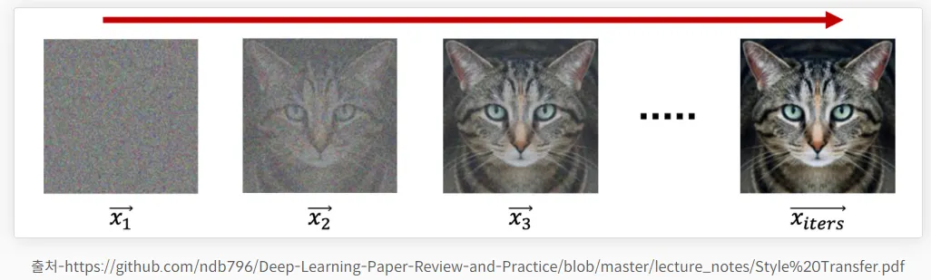 노이즈 이미지에서 시작해 콘텐츠 정보와 스타일 정보를 모두 가져오면서 훈련을 한다.