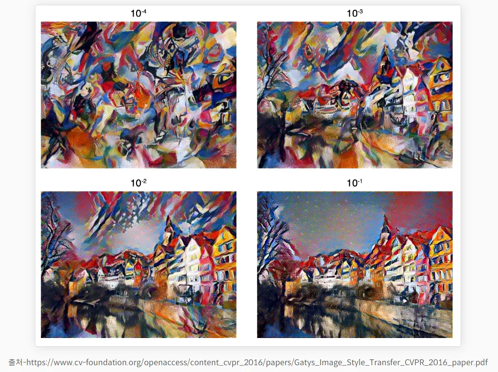 콘텐츠 손실의 가중치(α)와 스타일 손실의 가중치(β) 비율에 따라 생성되는 이미지가 다르다는 말이다.