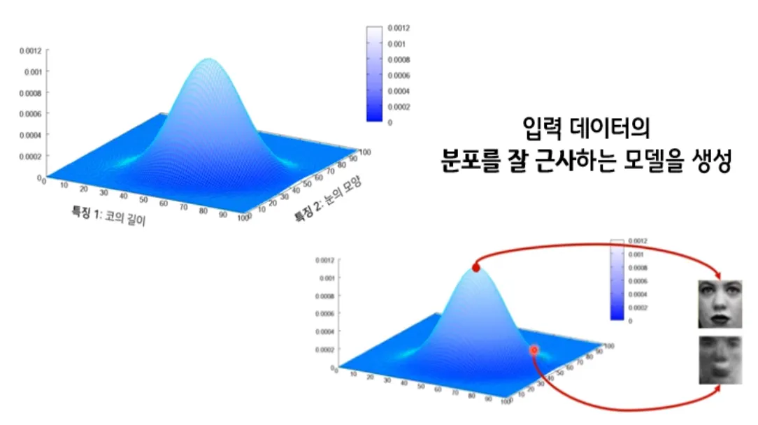이런 확률 분포를 잘 찾아내고, 확률값이 높은 부분을 이용하면 실제에 있을법한 이미지를 새롭게 만들 수 있을 것이다.