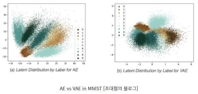 아래 그림은 MNist 데이터를 각각 AE와 VAE로 특징을 추출해 표현한 그림이다.