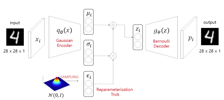 이 과정은 샘플링 과정에서의 불확실성을 반영하면서도 미분 가능한 방식으로 설계된 것으로, VAE에서 중요한 재매개변수화 트릭(Reparameterization Trick)이다.