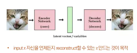 Input image X를 Encoder에 통과시켜 Latent vector z를 구하고, Latent vector z를 다시 Decoder에 통과시켜 기존 input image X와 비슷하지만 새로운 이미지 X를 찾아내는 구조