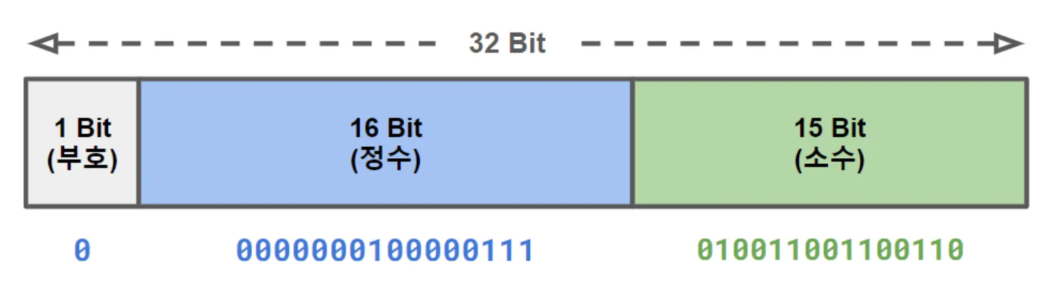 예를 들어, 263.3이라는 숫자를 4바이트(32비트) 시스템에서 표현한다고 가정하였을 때, 여기서 부호는 1비트, 정수 부분은 16비트, 소수 부분은 15비트를 사용한다고 한다.