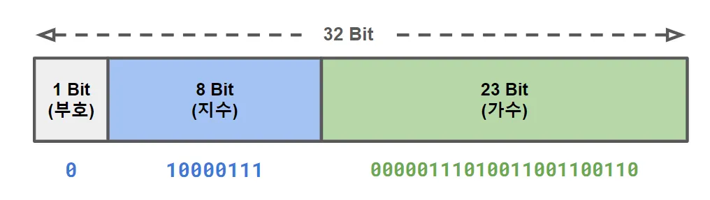 이런 식으로, 263.3은 부동소수점으로 표현될 때 부호, 지수, 가수 부분을 각각 0, 10000111, 00000111010011001100110으로 나타낼 수 있다.