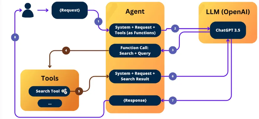 System + Request + Tools as Functions: 에이전트는 시스템과 툴을 함께 사용하여 요청을 처리할 준비를 한다.