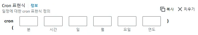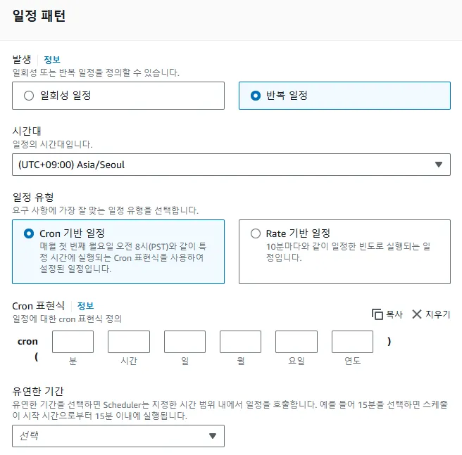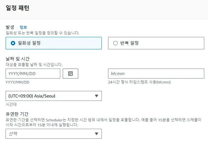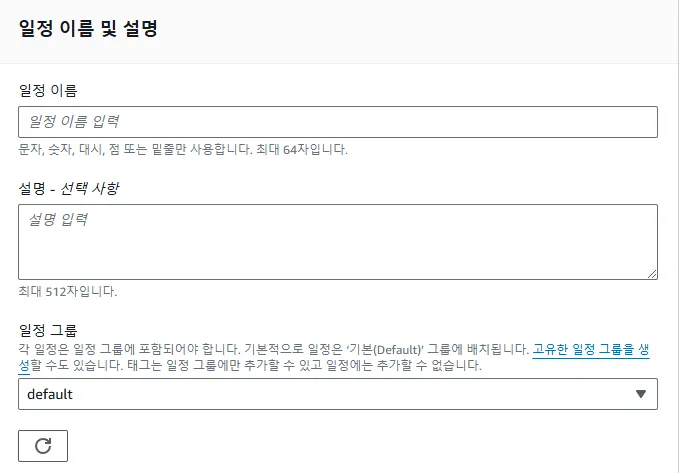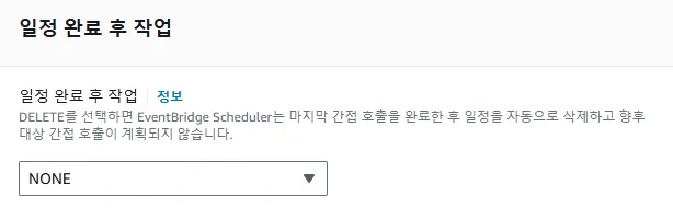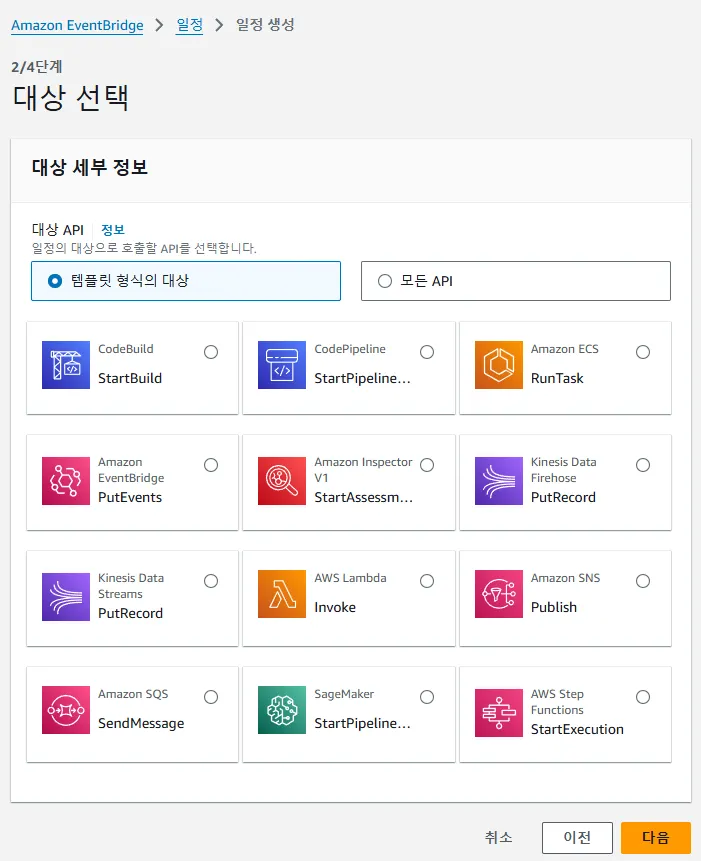 대상 API: 이 섹션에서는 일정을 통해 호출할 수 있는 AWS 서비스의 API를 선택한다. EventBridge에서 발생한 이벤트에 따라 지정된 API 호출을 통해 다양한 AWS 서비스와 상호작용이 가능하다.