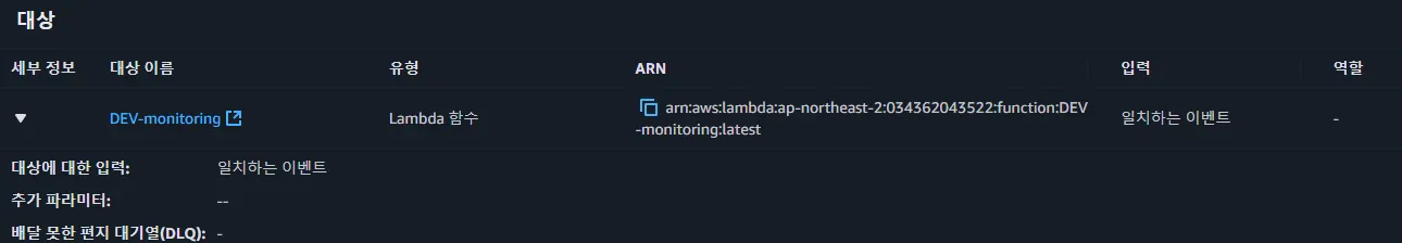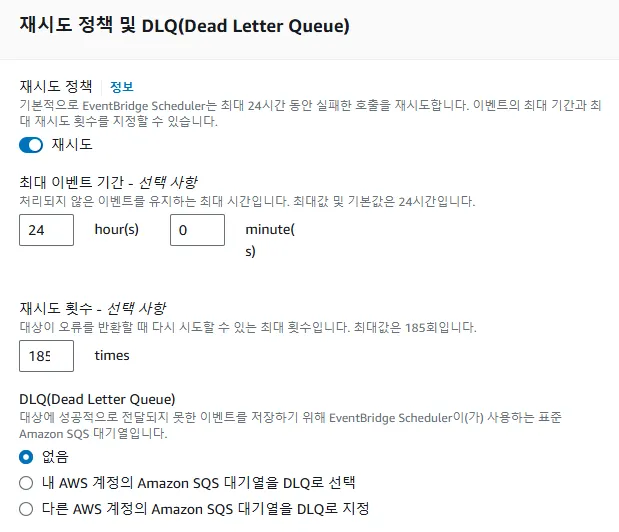 DLQ(Dead Letter Queue): 재시도 후에도 실패한 이벤트를 Amazon SQS 대기열에 저장하여 이후에 검토할 수 있다. "없음", "내 AWS 계정의 SQS 대기열", "다른 계정의 SQS 대기열" 중 선택 가능하다.