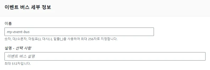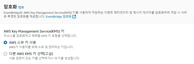 이벤트 KMS key EventBridge 버스에 저장된 이벤트 데이터를 암호화할 때 사용할 형식 선택