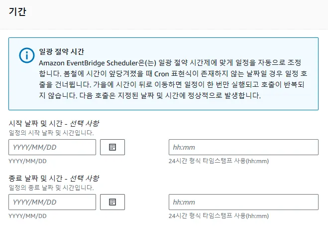 종료 시간: 일정을 종료할 시간을 지정하며, 24시간 형식(hh:mm)을 사용한다. 이 종료 시간 이후에는 일정이 트리거되지 않는다.