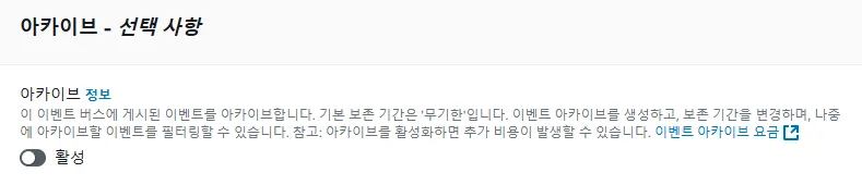 활성화: 아카이브 기능을 활성화하면 이벤트가 보존되고 필요에 따라 복구할 수 있다. 참고로, 아카이브 기능을 활성화하면 추가 비용이 발생할 수 있다.