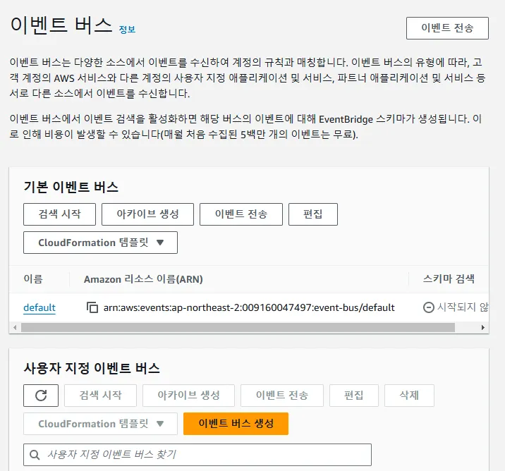 스키마 검색: 이 기능을 활성화하면 이벤트 버스에서 발생하는 이벤트의 스키마를 자동으로 추론한다. 즉, 수신된 이벤트의 형식을 자동으로 분석하여 구조를 파악한다.