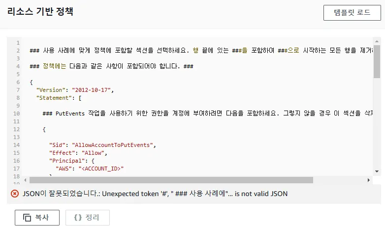 리소스 기반 정책: 이 영역에서는 이벤트 버스에 대한 권한을 설정할 수 있는 JSON 정책을 작성할 수 있다. 권한 정책을 추가하면 특정 IAM 역할이나 사용자에게 이벤트 버스에 접근할 수 있는 권한을 부여할 수 있다.
