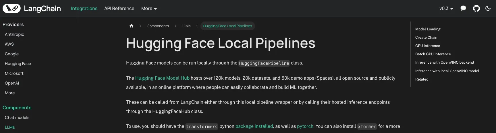 이러한 호출은 로컬 파이프라인 래퍼를 통해 LangChain에서 호출하거나 HuggingFaceHub 클래스를 통해 호스팅된 추론 엔드포인트를 호출하여 호출할 수 있다.