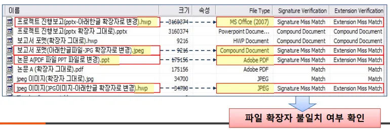 해당 파일 구조를 비교하여 파일 확장자의 이상 유무를 판별, 불일치하는 경우 사용자가 고의적으로 은닉할 수 있으므로 실제 파일을 추출하여 분석