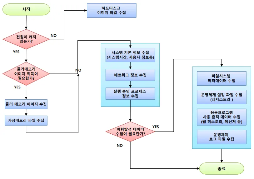 시스템의 전원을 차단하면 수집할 수 없는 휘발성 데이터와 신속한 조사에 필요한 비휘발성 데이터를 선별해서 수집