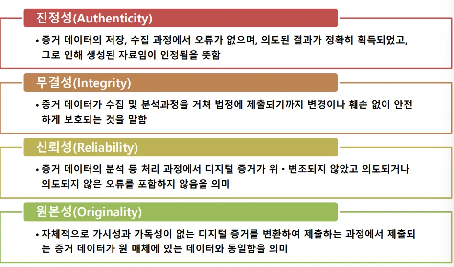 디지털 증거가 법적 효력을 가지고 증거능력을 인정받기 위해서는 디지털 증거의 진정성, 무결성, 신뢰성, 원본성이 기본적으로 보장되어야 함