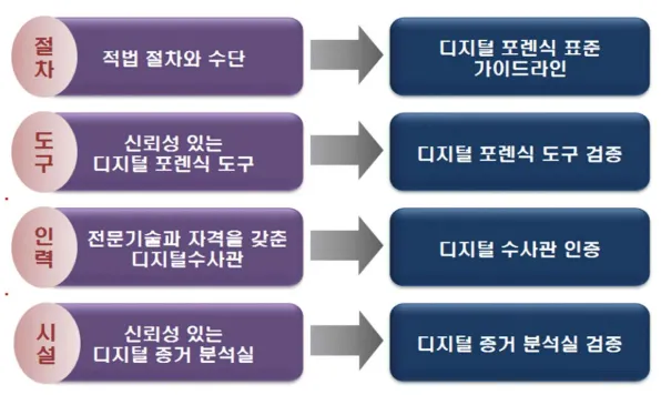 신뢰성 확보를 위한 제도적, 과학적 절차의 마련이 필요하며, 이는 곧디지털 포렌식 연구 목표와 동일