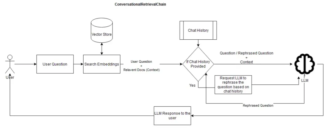 ConversationalRetrievalChain은 채팅 기록에 대해 초기 쿼리를 참조하지 않아서 전체 질문 재구성 단계를 숨긴다.
