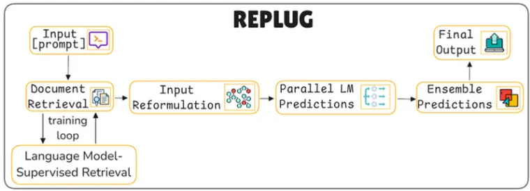 그래서, 이러한 LM 부분을 fixed-black box로 두고, retrieval에 대해서만 훈련하며, LM과 retriever을 탈부착하는 개념으로 둔 새로운 retrieval-augmented LM framework인 REPLUG(Retrieve and Plug)를 제안했다.