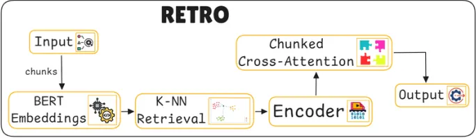 사전 학습된 BERT 임베딩을 사용해 관련된 조각(chunks)을 찾아내고, 이를 통해 모델의 예측을 개선하는 chunked cross-attention 메커니즘을 사용하여 보다 적은 계산 자원으로도 효율적인 예측을 가능하게 한다.