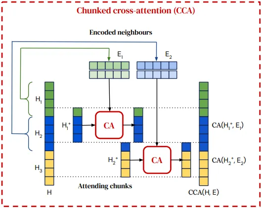 이때 청크 단위 교차 주의(chunked cross-attention) 메커니즘이 사용된다. 이 메커니즘은 검색된 유사 청크들이 각 입력 청크의 예측에 영향을 미치도록 하며, 청크 단위의 병렬 처리를 통해 효율적인 계산이 가능하다.