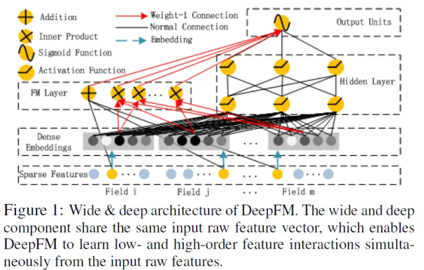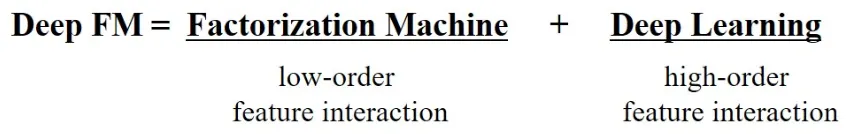 Factorization Machine(FM)과 Deep Neural Network(DNN)을 결합하여, low-order feature interaction과 high-order feature interaction을 동시에 학습하는 CTR 예측 모델.