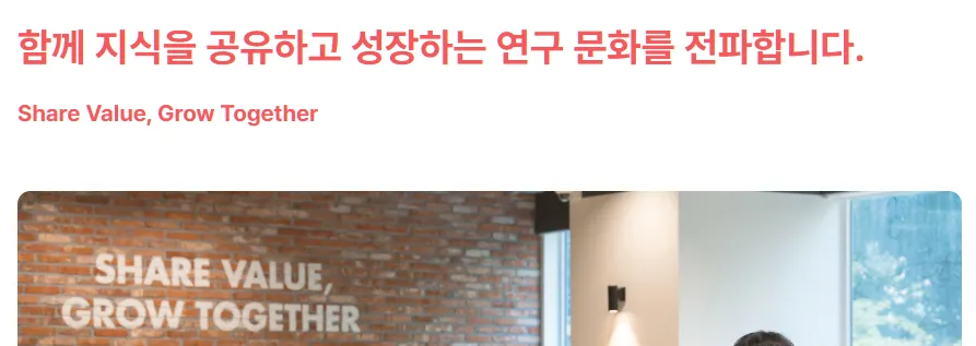 홈페이지에 나와있는 가치관: ‘함께 지식을 공유하고 성장하는 연구 문화를 전파하는 것’
