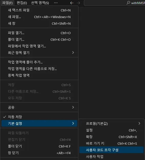 1. 기본 설정에서 사용자 코드 조각 구성으로 진입