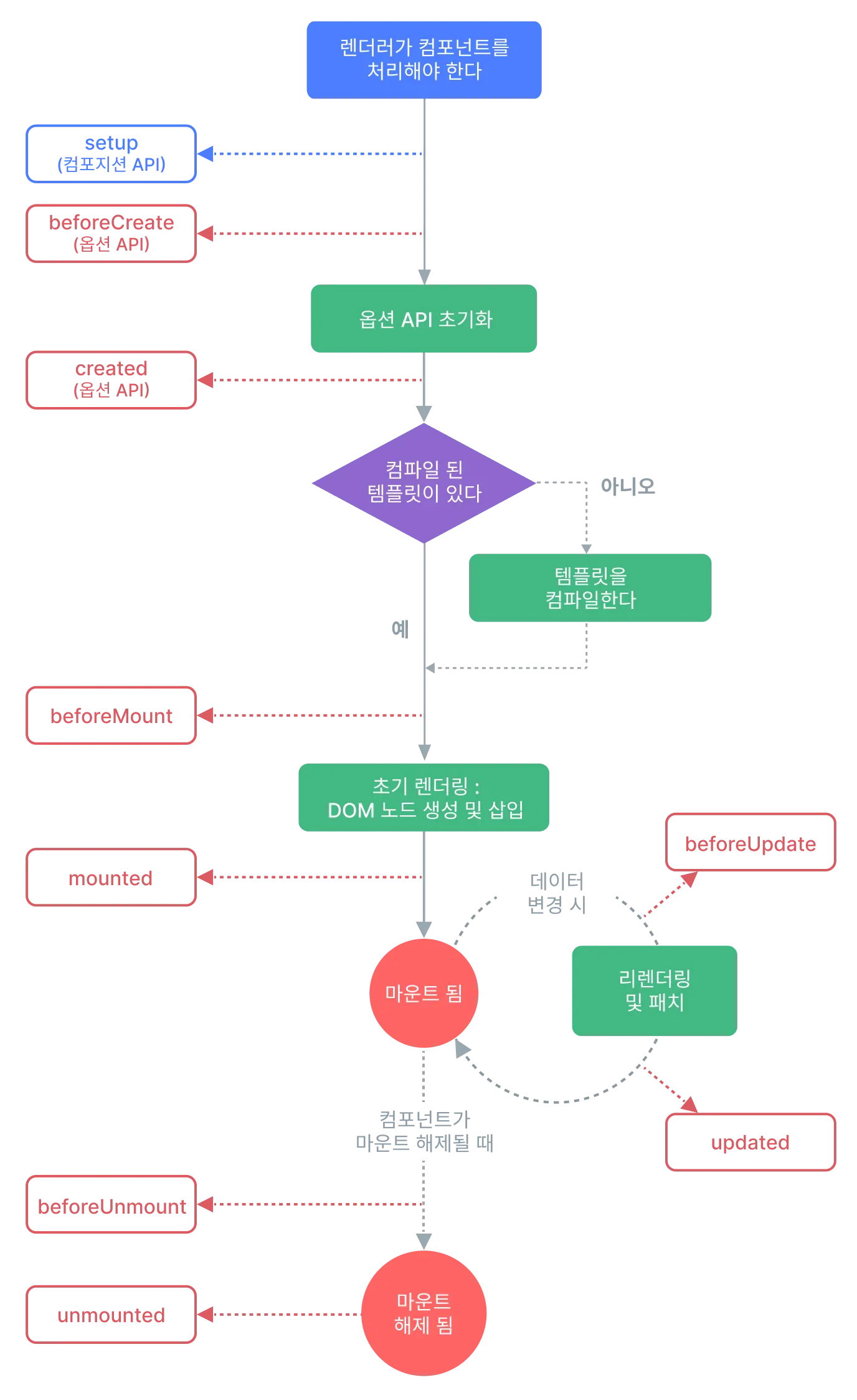 자체 DOM 트리가 생성되어 상위 컨테이너에 삽입됨. 앱의 루트 컨테이너가 Document 내에 있는 경우에만 컴포넌트의 DOM 트리가 문서 내에 있음을 보장