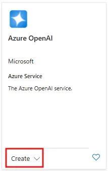 리소스 만들기를 선택하고 Azure OpenAI를 검색. 서비스를 찾으면 만들기를 선택.